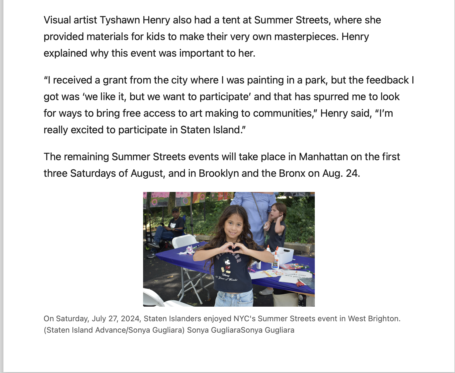 Tyshawn received a City Artist Corps grant in 2021 from the City of New York. The purpose was to bring engaging arts experiences to our neighborhoods. After a series of painting events in a local park, feedback from neighbors was they wanted to participate. Summer Arts brings arts making opportunities to New York City residents.